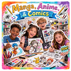 Calling all storytellers, illustrators, and character creators. This camp dives into the world of expressive eyes, dynamic poses, and bold comic style. Campers will design original characters, develop backstories, experiment with manga-inspired drawing techniques, and bring their ideas to life on the page. Whether they love anime, graphic novels, or inventing their own heroes, this week is packed with creativity and imagination.